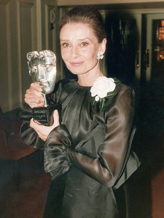 Audrey Hepburn receiving the BAFTA Lifetime Achievement Award in 1992.
