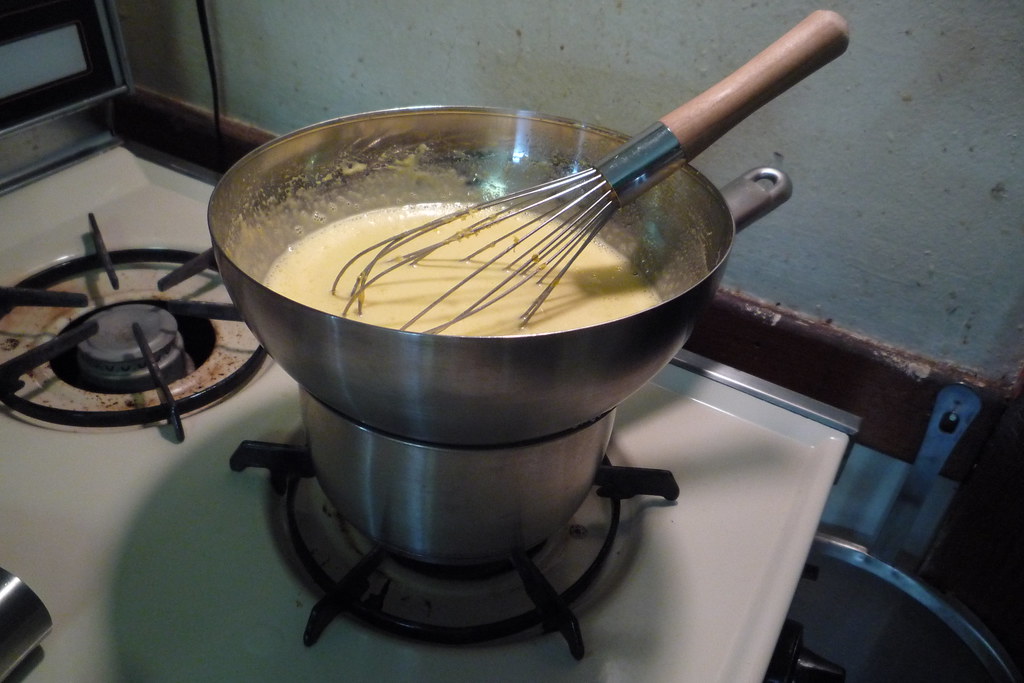 - Bring about 1 1/2 inches of water to a boil in a pot that is slightly smaller than the diameter of the bowl you will be using for the sabayon. Meanwhile, in a large metal bowl, whisk the eggs, yolks, and sugar for about 1 minute, or until the mixture is smooth.